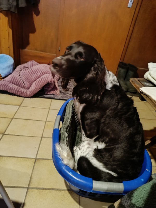 Mittlerweile passen die Welpen nicht mehr in den Einkaufskorb. Während die Bettwäsche gewechselt wird, hab ich die Welpen im Wäschekorb geparkt. Ayka hat zugeschaut.