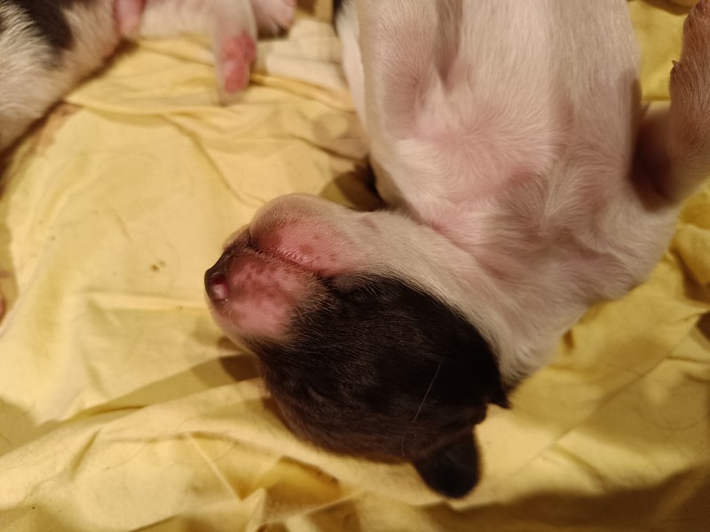 Die Stehohren klappen jetzt um, die Gehörgänge öffnen sich. Bald können die Welpen Geräusche wahrnehmen.
