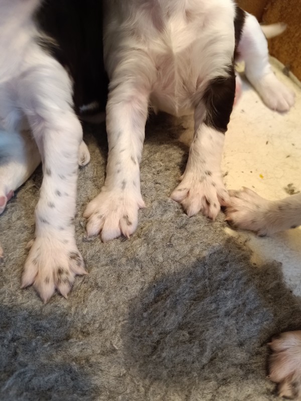 Die bei der Geburt rosa Nasen beginnen jetzt dunkel zu werden und auf den Sohlen erscheinen vereinzelt dunkle Flecken.