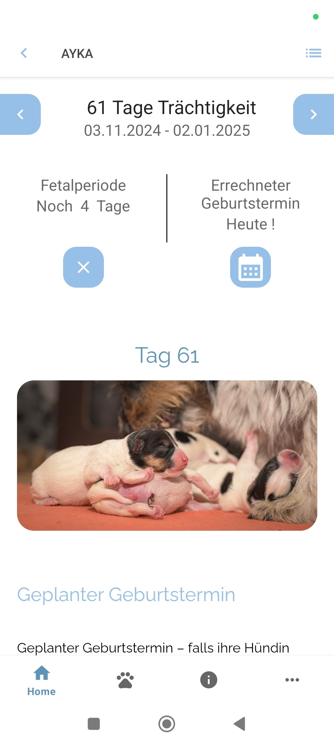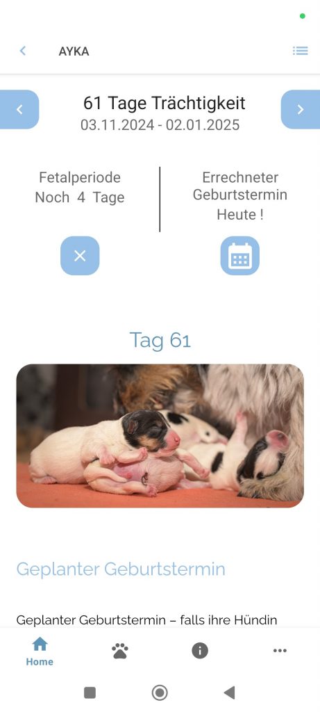 Was tut man nicht alles, um sich auf die bevorstehende Geburt und mögliche Komplikationen vorzubereiten: Bücher, online Seminare und eine fachgerechte App fürs Handy ist auch nützlich. Die sagt im Trächtigkeitskalender für heute den Wurftermin voraus.