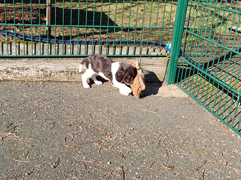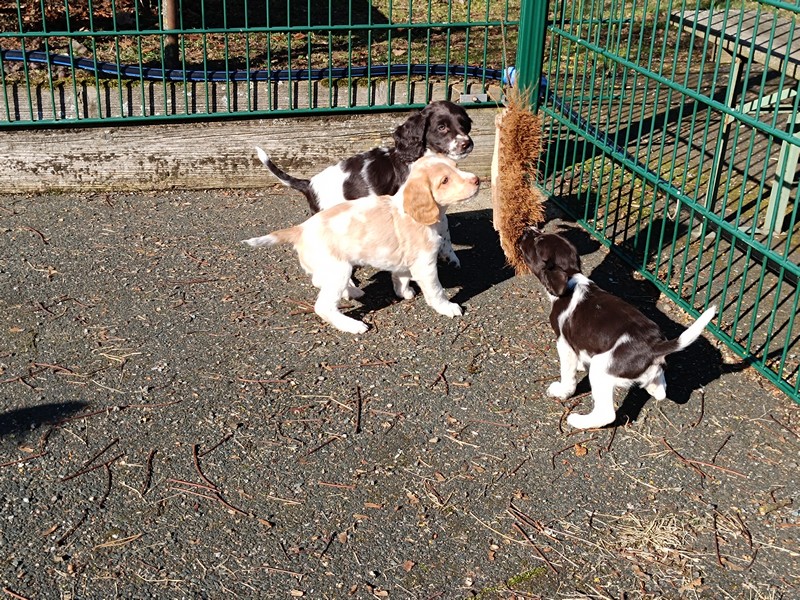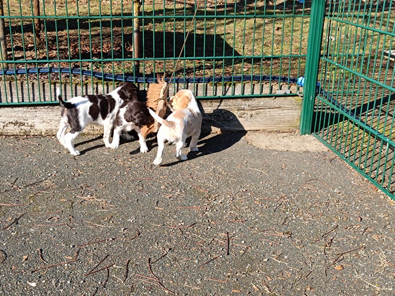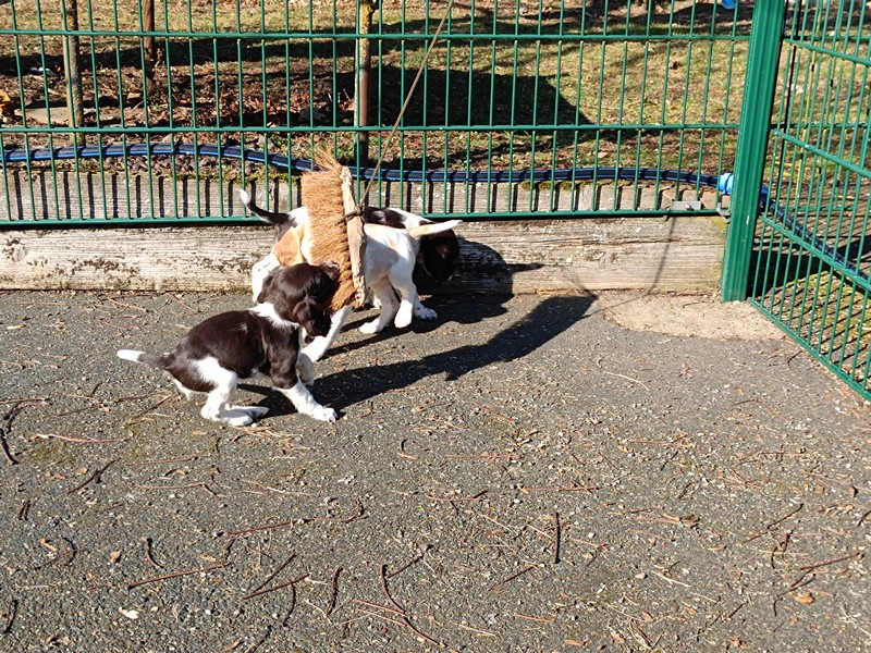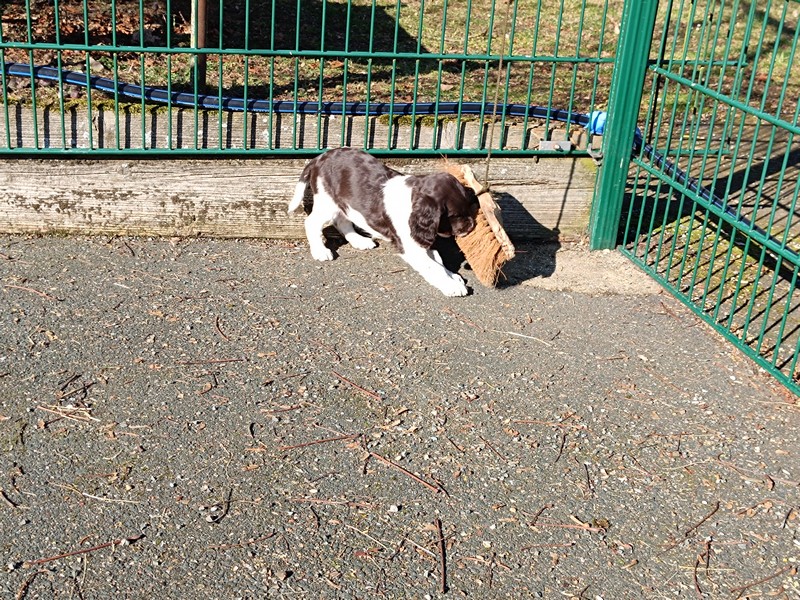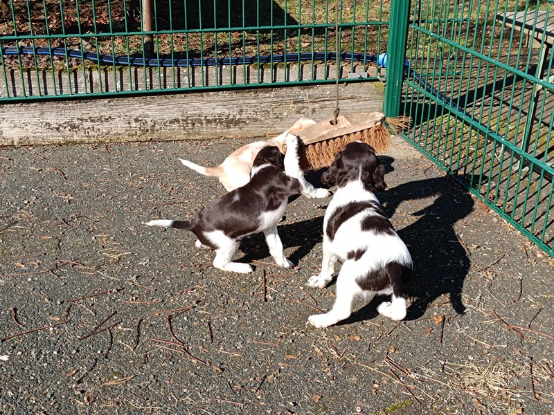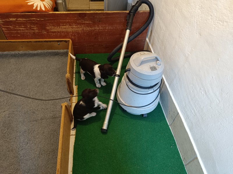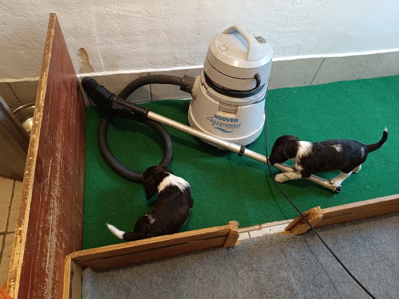 Bevor der nächste Besuch kommt, muss wieder einmal Hausputz gehalten werden – während die Welpen ihr Mittagessen bekommen. Die ersten sind schnell zurück und untersuchen das interessante Teil was auch noch Geräusche macht.